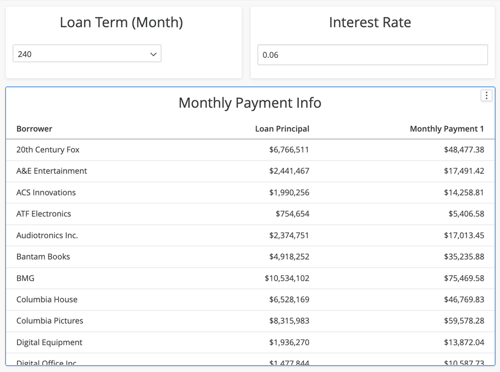 이제 사용자는 웨어하우스에서 제공되는 대부금 원금 데이터를 사용하여 이율 및 보증 기간 변경을 기반으로 한 가상 분석을 수행할 수 있습니다.