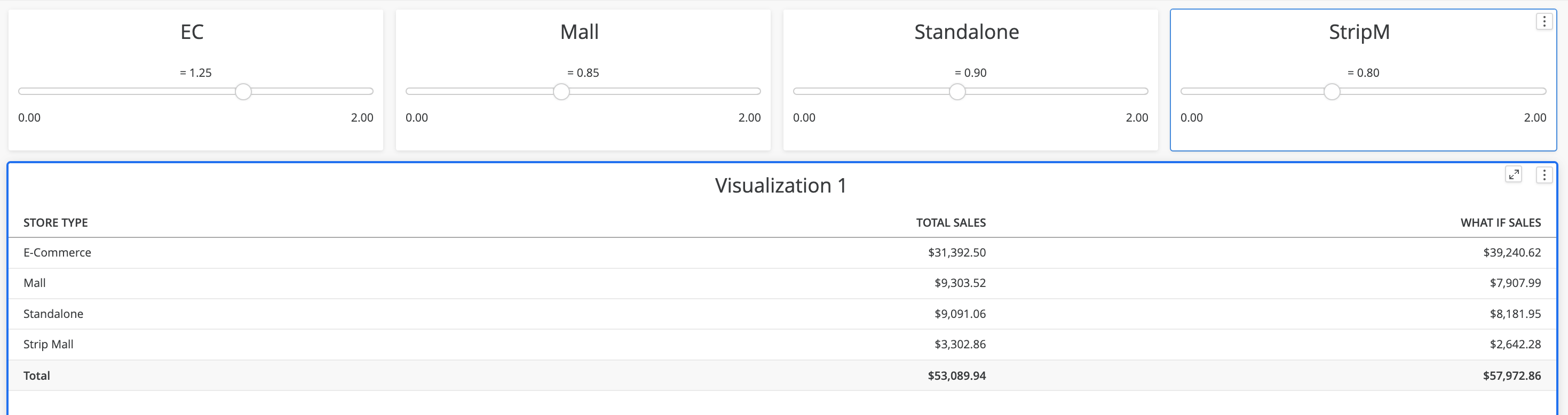 가상 분석에 보다 세부적인 레벨의 컨트롤을 추가할 수도 있습니다. 온라인, 몰, 독립 실행형 및 상점가 몰 등 다양한 판매 장소 유형에 따라 가상 판매 분석을 수행하겠습니다.