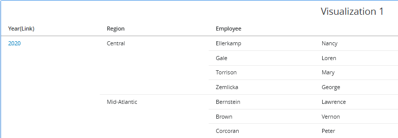 사용 가능한 애트리뷰트 링크를 클릭하여 이 매개 변수를 대상 대시보드에 필터로 동적으로 전달할 수 있습니다. 예를 들어, 2020을 클릭하여 대상 대시보드에 필터로 전달합니다.