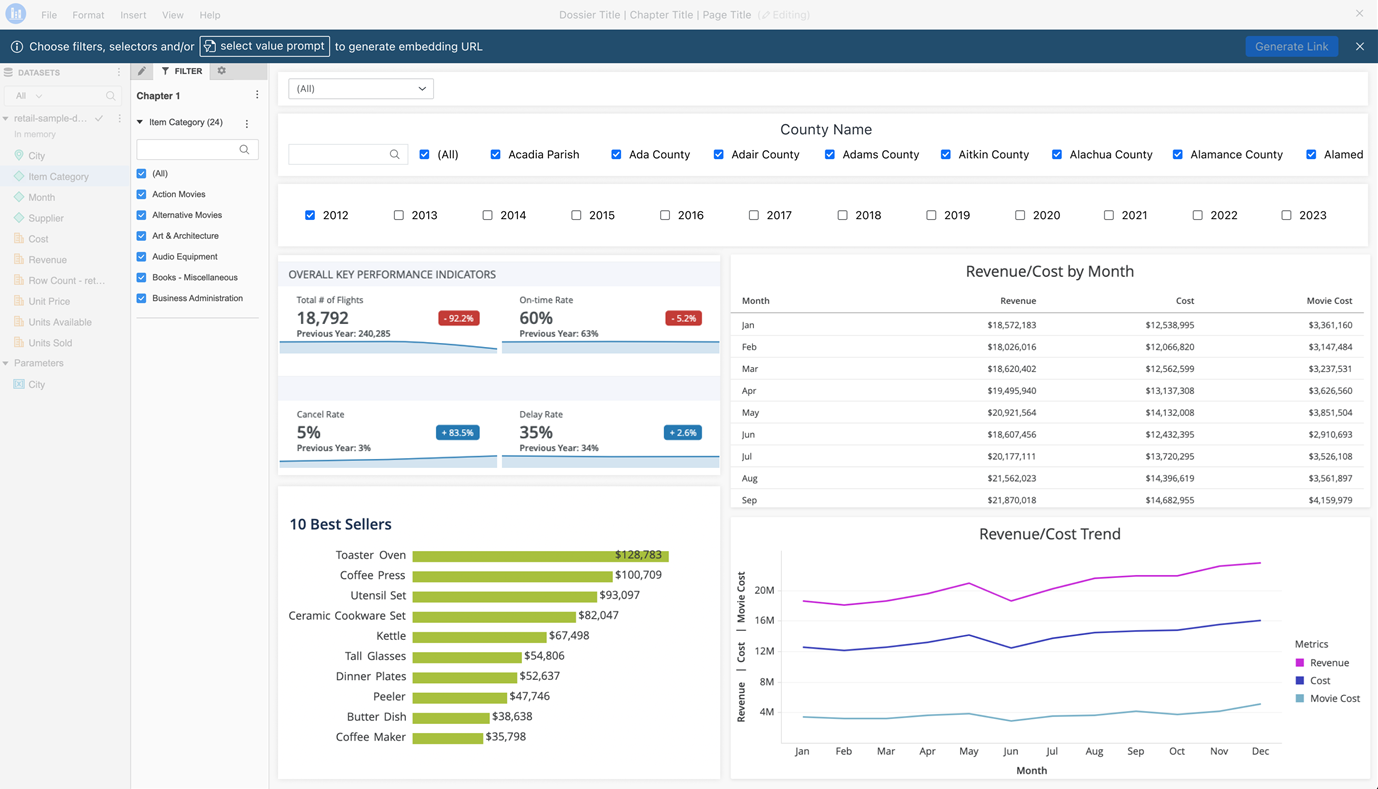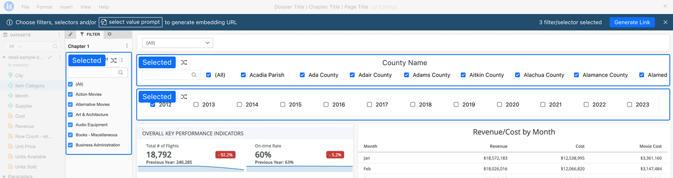 MicroStrategy ONE (2024년 12월)부터 대시보드의 URL API를 사용하여 매개 변수 필터 및 값 프롬프트를 동적으로 전달할 수 있습니다. URL을 통해 필터, 선택기 및 값 프롬프트 전달 API가 작성 경험을 개선하여 링크 생성 프로세스를 단순화합니다.