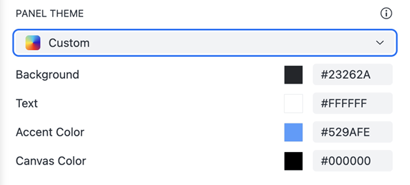 - 패널 테마는 봇의 다양한 요소의 색상을 정의합니다. 에서패널 테마드롭다운에서 미리 정의된 테마 선택 또는사용자 정의을(를) 클릭하여 자신의 테마를 만듭니다.