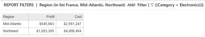 프롬프트가 필터에 포함된 경우 Library에서 사용하는 동안 리포트 필터 요약에 프롬프트 응답이 표시됩니다. 시작 위치(Undefined variable: Company_ProductNames.ReleaseName) (2025년 3월)부터 필터의 추가 레벨에 대한 정의 대신 프롬프트 응답이 표시됩니다. 이는 프롬프트 안에 프롬프트가 포함된 리포트 등 프롬프트가 높은 리포트에 적용됩니다. 예를 들어, 리포트에 지역에 대한 애트리뷰트 요소 프롬프트와 리포트에 대한 필터를 선택하는 개체 프롬프트가 포함되어 있습니다. 해당 필터 중 하나에는 프롬프트가 표시되며, 표시할 범주를 선택할 수 있습니다. 선택한 지역 및 범주가 리포트 필터 요약에 다음과 같이 표시됩니다.