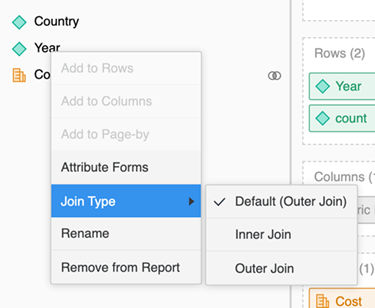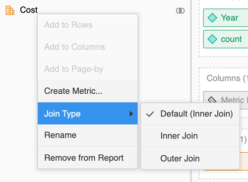 메트릭 조인 유형 > 개체 및 편집기 패널에서 메트릭을 마우스 오른쪽 버튼으로 클릭