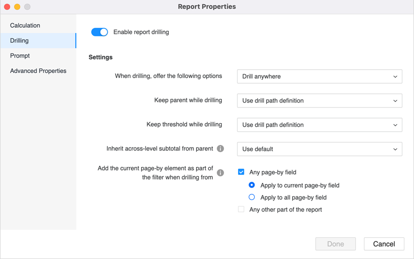 리포트 세부 사항이 고급 속성 대화 상자로 분할되었습니다. SQL 보기가 추가되었습니다.