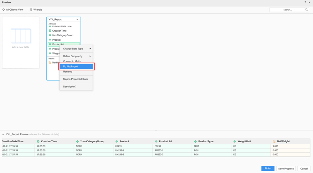 중복 열을 제거하려면 미리보기 대화 상자에서 을(를) 마우스 오른쪽 버튼으로 클릭합니다. 곱 01 > 가져오기 안 함 .