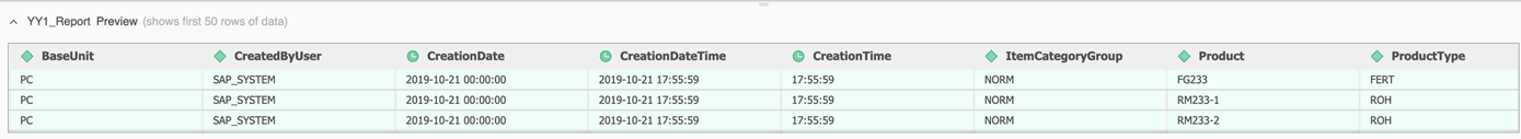 서비스에서 사용자 정의 CDS 보기를 생성했습니다. I_ 제품 , 제품 생성 시간, 날짜 관련 특정 열, 유형 및 가중치와 관련된 세부 사항이 포함됩니다.