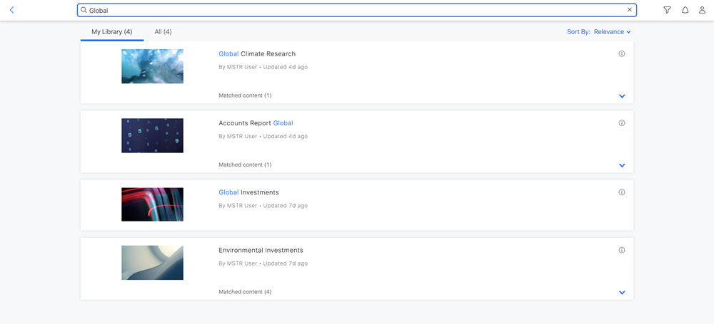 검색 페이지의 아래에서 일치하는 콘텐츠를 확인합니다. 내 라이브러리에서또는모두 . 기본적으로 Library 내의 항목이 표시됩니다. 해당모두섹션에 현재 라이브러리 외부의 검색 결과가 포함되어 있습니다. 이를 "전체 검색"이라고 합니다.