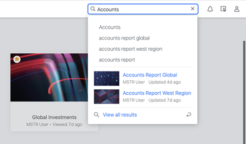 검색 결과에 특정 검색어가 포함된 대시보드, 챕터, 페이지, 시각화, 애트리뷰트 및 메트릭 이름이 표시됩니다. 예를 들어, 검색어에 " 계정" 또는 "지역"이 포함될 수 있습니다. 지역은 대시보드 페이지의 시각화 제목 또는 대시보드에 사용된 애트리뷰트와 일치할 수 있습니다.