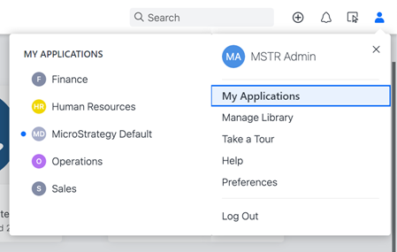 애플리케이션에는 ACL( 접근 제어 목록)이 적용되므로 관리자는 사용자에게 여러 애플리케이션에 대한 액세스를 부여하여 콘텐츠의 다양한 데이터 경험 또는 프레젠테이션을 제공할 수 있습니다. MicroStrategy 2021 Update 6부터 사용자가 둘 이상의 애플리케이션에 액세스할 수 있는 경우내 라이브러리툴바의 계정 아래에서 옵션을 클릭합니다.