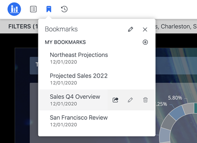 북마크를 사용하여 분석 고유의 개인 보기를 저장할 수 있습니다. 북마크는 필터 외에도 대시보드에 연속 조작(예: 캔버스 내부 필터링, 드릴링 또는 정렬)을 저장합니다. 여러 북마크를 쉽게 저장하고 볼 수 있습니다.