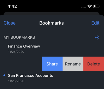 MicroStrategy ONE 에서 시작 (2024년 12월)부터 오프라인에서 사용할 수 있도록 단일 북마크를 사전 캐시할 수 있습니다. 오프라인으로 북마크를 사용할 수 있게 되면 북마크 목록의 해당 북마크 근처에 녹색 확인이 표시됩니다.