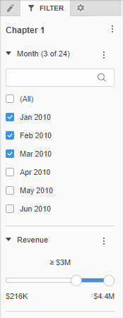 Le panneau Filtre affiche une liste de tous les filtres pour le chapitre actuel. Les sélections que vous faites dans le panneau Filtre affectent chaque visualisation dans le chapitre actuel du portfolio. Un filtre sur un chapitre filtre également les données dans tous les objets du jeu de données (c'est-à-dire, les attributs et les mesures) dans les champs de texte du chapitre.