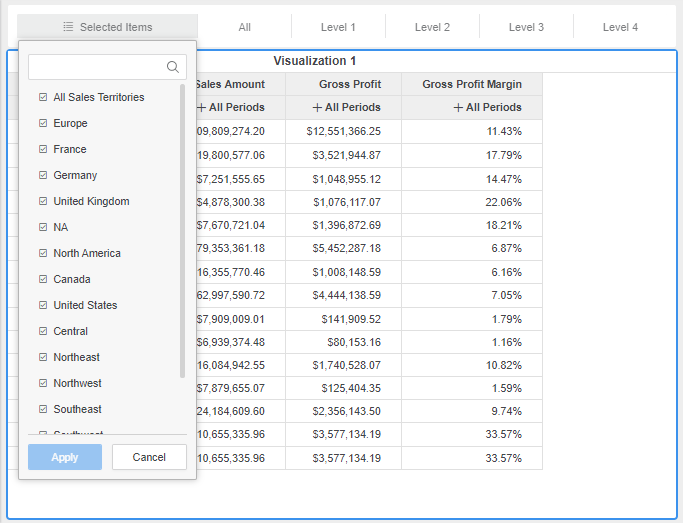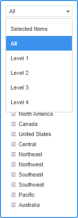 - Cliquez sur Éléments sélectionnés, Tous, Niveau 1,Niveau 2, etc., pour afficher les filtres correspondants et effectuer vos sélections. L’option Éléments sélectionnés affiche les filtres sélectionnés. L’option Tous affiche une liste des filtres disponibles. Les options Niveau 1, Niveau 2, etc. affichent les filtres de chaque niveau de hiérarchie.
