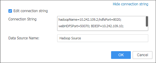 nameservice1连接字符串应如下所示:hadoopName=10.242.109.2;hdfsPort=8020;BDEIP=10.242.109.10;BDEPORT=10109;hadoopNameService=nameservice1; - 单击确定。