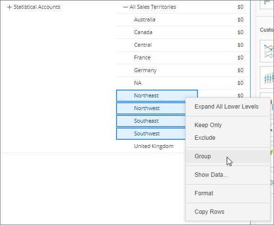 en el panel Conjuntos de datos de forma predeterminada. El nombre del atributo cambiará a NombreAtributo (Grupo), donde NombreAtributo es el atributo del que ha seleccionados los elementos. Para cambiar el nombre del atributo agrupado, haga clic en él con el botón derecho en el panel Conjuntos de datos, seleccione Cambiar nombre y escriba el nuevo nombre. - Para eliminar un grupo, haga clic con el botón derecho en él y elija Desagrupar.