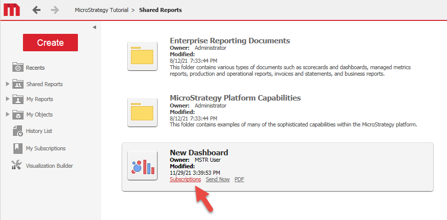 To verify that you are subscribed to the report or document, click the Strategy icon Projects icon at the top of the page and select My Subscriptions.