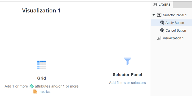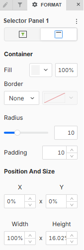 A selector panel acts as a mini dashboard canvas. You can add the following objects to them: