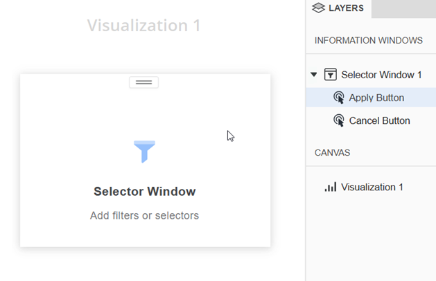 and choose Selector Window. The new window is added to page. In the Layers panel, a new section has been added for information windows. The rest of the dashboard objects are shown in the Canvas section. You can return to the dashboard canvas by selecting an element under Canvas in the Layers panel.
