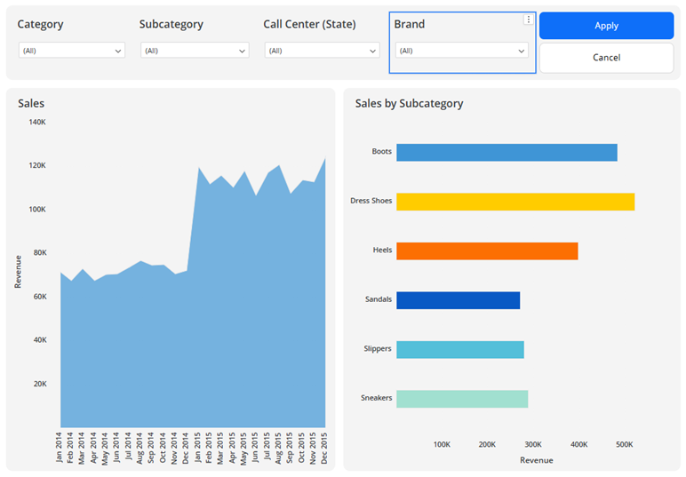 In the example below, a selector panel contains filters for Category, Subcategory, Call Center, and Brand. Make your selections in any or all of the filters, and click Apply to update the targeted visualizations, in this case the Sales line graph and Sales by Subcategory bar graph.