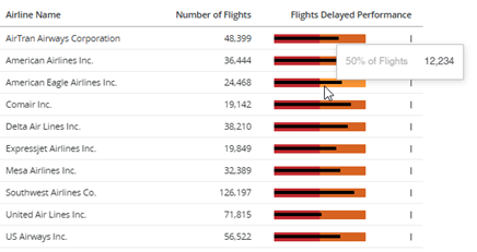 The modern grid shown below displays the number of flights and a bullet microchart for each airline name, that is, each row.