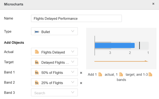 The bullet microchart provides a quick view of performance against a target. It displays as a horizontal bar that represents the actual value, a target marker that indicates the goal, and at least one band. Use the bands to show performance thresholds such as good, average, and poor; interim targets, or a way to evaluate the actual metric's progress toward the target. The example below tracks the performance of delayed flights against a goal, with bands marking 1/3 and 2/3 towards the goal.