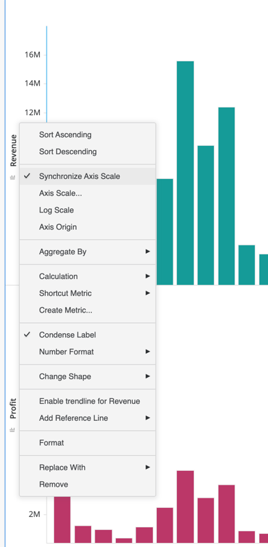 For example, from a quick glance at this chart on the left, it appears as though revenue and profit are almost the same, which is misleading to end users. As seen in the chart on the right, the Synchronized Axis Bar Chart allows users to quickly visually understand the true relationship. Users can enable this on existing dual bar charts by right-mouse-clicking the axis or changing the visualization type to Synchronized Axis Bar Chart.