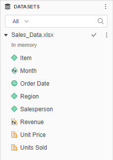 The Datasets panel displays all available datasets, as well as the attributes and metrics in each dataset that can be added to your dashboard.