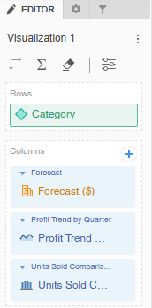 For example, the Editor panel below displays a modern grid that contains the Category attribute in the rows, a Forecast column set displaying the Forecast ($) metric, the Profit Trend by Quarter sparkline microchart, and the Units Sold Comparison by Industry trend bar microchart.