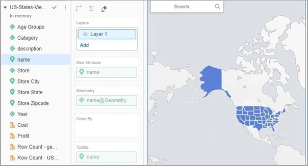 You can link attributes between your custom shape file and other datasets. In the example below, the attributes name in the shape file and state in the dataset contain corresponding values. Linking the two attributes allows you to add metrics from the dataset to the geospatial services visualization. For example, adding Cost to the Color By drop zone will apply the custom shapes to only the states that contain a Cost value in the dataset.