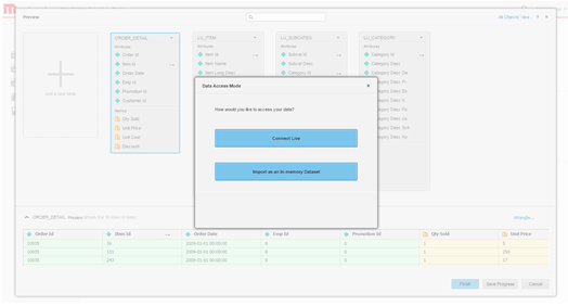 - Connect Live Approach: In situations where the data for the dashboard needs to be current, or if the data is at a level of detail that all the data cannot be stored in the in-memory cube, then building a dashboard using the connect-live option could be a suitable approach. This allows the latest data to be fetched from the warehouse upon each execution. This approach is also useful in cases where the security is setup at the database level and a warehouse execution is needed for each user to be shown the data that they have access to. Use this approach when: