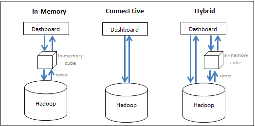 - Bring data into memory (in-memory approach) - data for the analysis is obtained exclusively from the in-memory cube. Strategy enables users to pull subsets of data, which could be up to hundreds of Gigabytes, from a Big Data source into an in-memory cube, and build reports/dashboards from the cube. Typically, a cube is setup to be published at regular intervals and is saved in the server's main memory, eliminating the time-consuming need to query the Big Data database.