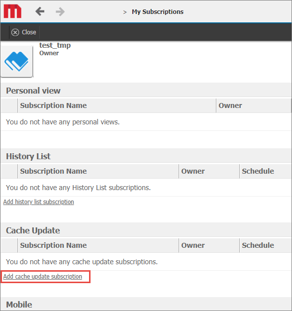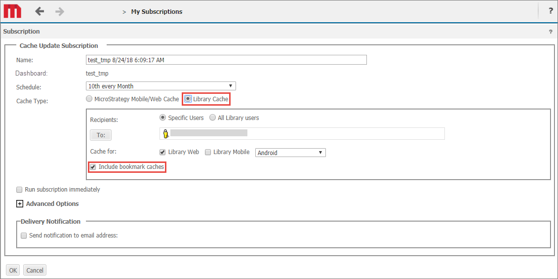 You can subscribe an individual dashboard to a cache update, and create all of the corresponding Library and Library Mobile dashboard caches. This subscription allows the dashboard to be loaded as quickly as possible in Library and Library Mobile using the latest available data, without having to generate a cache.