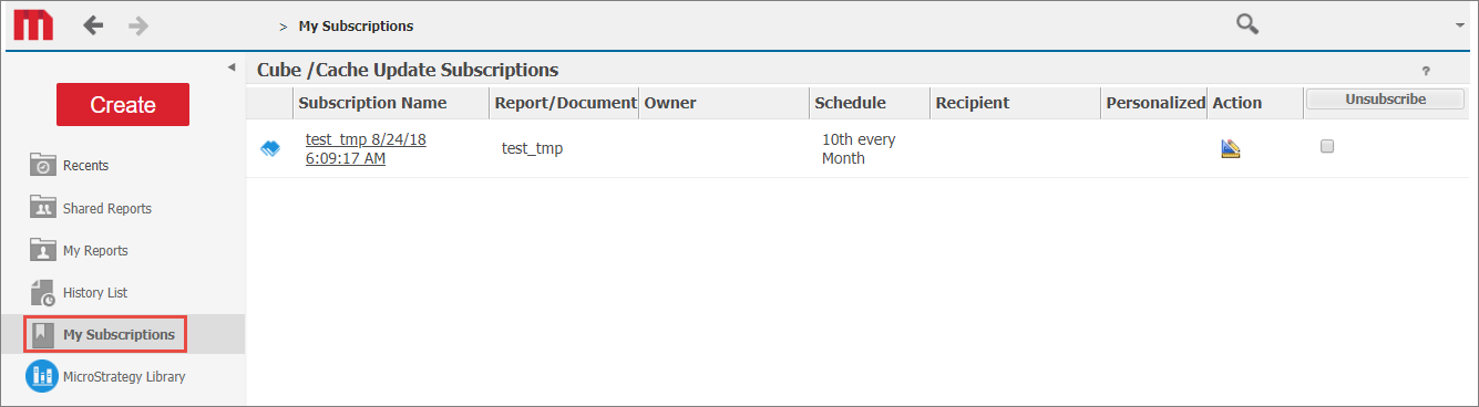 4. To verify that you are subscribed to the dashboard, click the Strategy icon MicroStrategy icon, and select My Subscriptions. A list of the items to which you are subscribed appears.