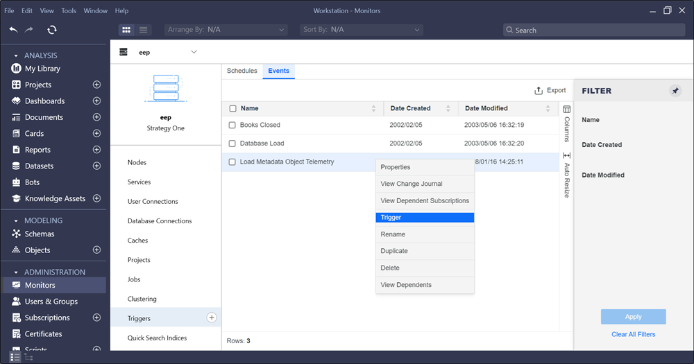Right-click the event Load Metadata Object Telemetry and choose Trigger.