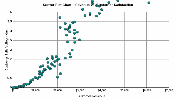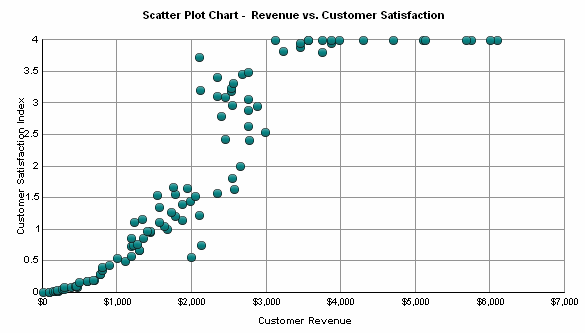 Show Values: This option displays all elements which fall outside of the specified range. These elements continue off the specified axes and are only constrained by the size of the graph area. In the graph below, data points with a Customer Satisfaction Index of more than four are shown continuing off the top of the graph.