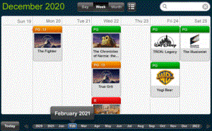 You can display events in the calendar using different colors depending on the event's category. For example, release dates for movies are displayed in the calendar, and the movies are divided into categories based on the rating of the movie. You can display movies rated PG in green, movies rated in PG-13 in yellow, and movies rated R in red, as shown below:
