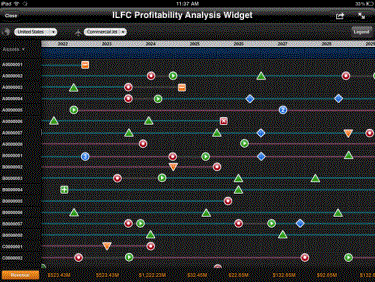 In the image below, each of the horizontal lines displayed in the timeline represents a different commercial jet. The lines are colored differently depending on their lease status. For example, periods in which planes are not currently leased are represented with a gray line. An icon is displayed along the line if an event has occurred to the airplane at a specific point in time, such as the airplane being sold, or the airplane being leased to a new company. There are metric values displayed at the bottom row of the widget, with a separate value displayed for each year, as well as metric values displayed in the rightmost column of the widget, with a separate value displayed for each asset.