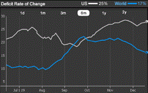 Time Series widget, which displays data in a line graph over a specific period of time. You can configure the widget to display multiple data series on the same graph. For example, the values of the Deficit Rate of Change metric for the US and World over a six-month period are displayed in the image below.