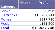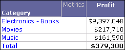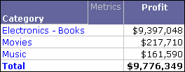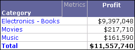 In a report with Category and Profit, you create a derived element defined as Electronics - Books. The derived element values as well as the individual attribute element values are excluded from the subtotal, as shown below.