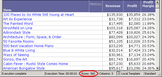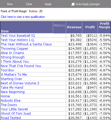 For the example scenario, create a report with Item, Revenue, Profit, and Profit Margin on the report, as shown in Creating view filters on a rank range of metric values.