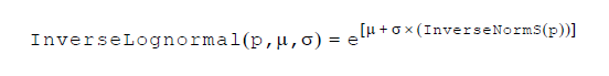 Returns the inverse of the lognormal cumulative distribution. Ln(x) is normally distributed using mean and standard deviation as parameters.
