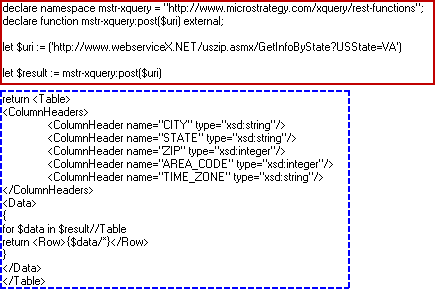 Requesting data from the web service: In the example XQuery statement shown above, the line let $uri := ('http:// www.webserviceX.NET/uszip.asmx/GetInfoByState?USState=VA') also defines the request for data from the web service. The request for data is included as the GetInfoByState?USState=VA part of the URL. For this web service, this requests data on the state of Virginia. However, not all web service requests can include the request for data as part of the URL. Refer to your third-party web service's documentation to determine the required syntax for the request of data.