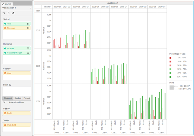 Attribute Group Metric Color By -> Size By -> Tooltip Graph Matrix (non-Pie) Attribute Vertical -> Color By -> Break By -> Horizontal Metric Horizontal -> Vertical -> Color By -> Size By -> Tooltip Graph Matrix (Pie) Attribute Color By -> Slice -> Vertical -> Break By -> Horizontal Metric Angle -> Horizontal -> Vertical -> Color By -> Size By -> Tooltip Map Attribute Geo Attribute -> Tooltip -> Latitude -> Longitude Metric Color By -> Size By -> Tooltip Network Attribute From Item -> To Item Metric Edge Color -> Edge Size -> Item Size Sample code is provided below to show you how to move objects from the bar chart shown below: