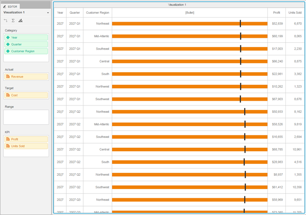 The objects are moved to the custom drop zones for the bullet chart shown below, using the following transition rules: