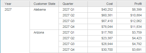 The data format is just as described in Data Interface API, but it follows certain rules if custom drop zones are defined. The data is still returned as a grid and can be retrieved using getRawData() and other APIs provided in DataInterface.js. The attributes and metrics are added to the corresponding default drop zones regardless of the definition of the custom drop zones. However, the order in which the zones are arranged is based on: