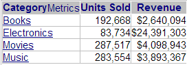 The instructions assume you are modifying the template plug-in provided for you. They provide the detailed JavaScript code needed for each visualization, with explanatory notes, as well as instructions for the changes that you need to make to the XML configuration files. The samples were created using the Units Sold, Revenue by Category report in the MicroStrategy tutorial as the dataset. This report, shown below, can be found in Shared Reports -> MicroStrategy Platform Capabilities -> MicroStrategy SDK.
