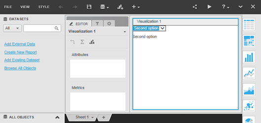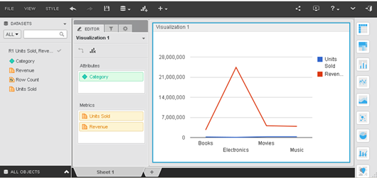 While the Units Sold, Revenue by Category report was used to create and test all of the samples, there is no requirement to use this specific report. None of the samples is closely tied to the report, and there are no hard-coded dependencies. The only data requirement for all the samples is that the report grid that the visualization is applied to must contain at least one attribute and one metric.