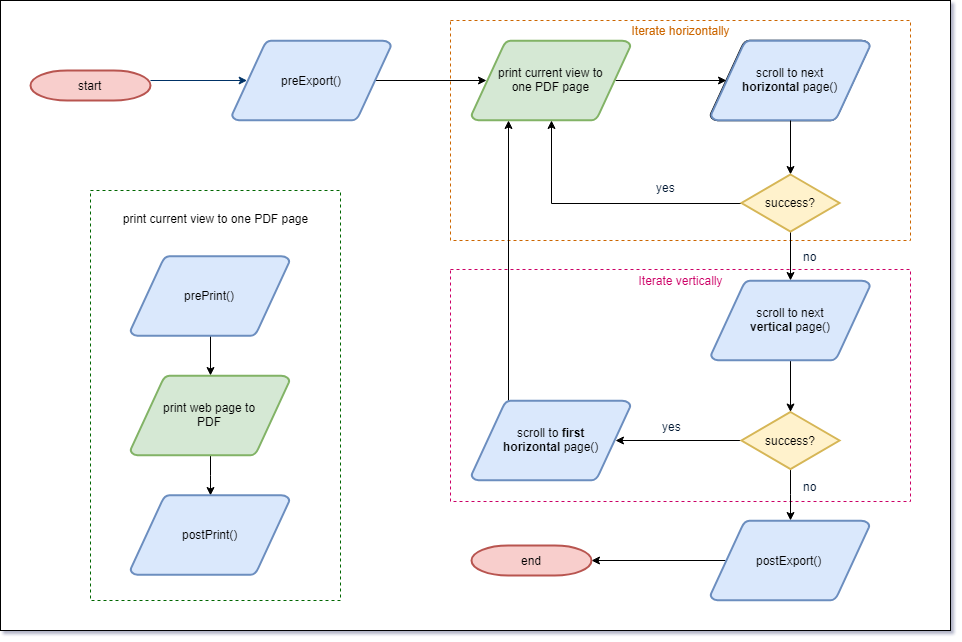 The flowchart below demonstrates the overview of the export framework for custom visualizations. The framework iterates over the content from left to right (horizontal pagination) and then from top to bottom (vertical pagination). The blue nodes in the graph are the APIs that can be overwritten to customize the behavior of the pagination workflow.