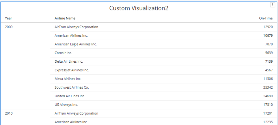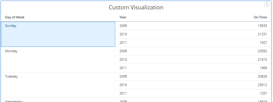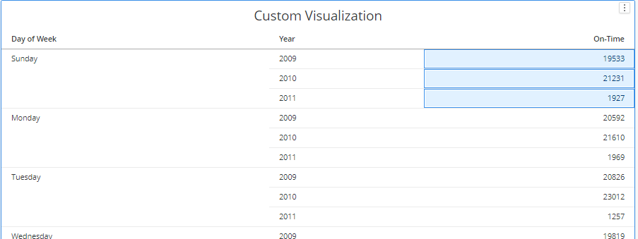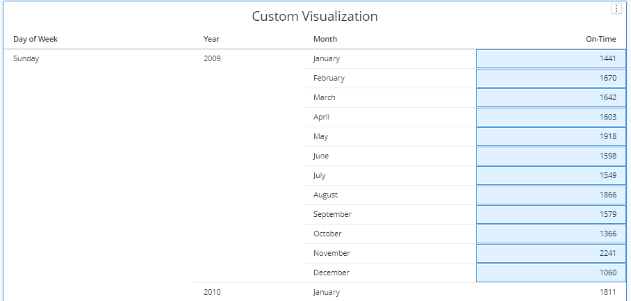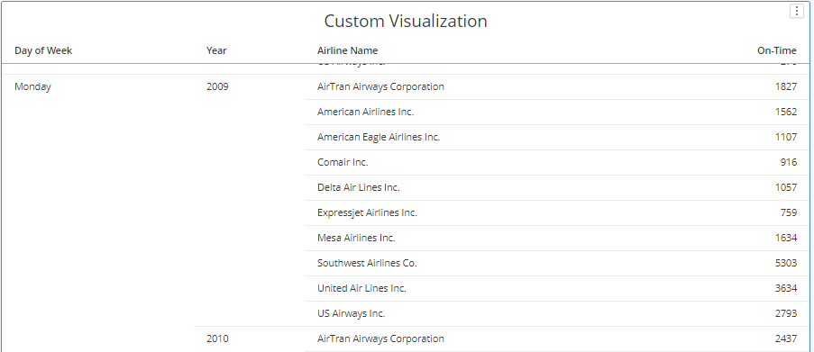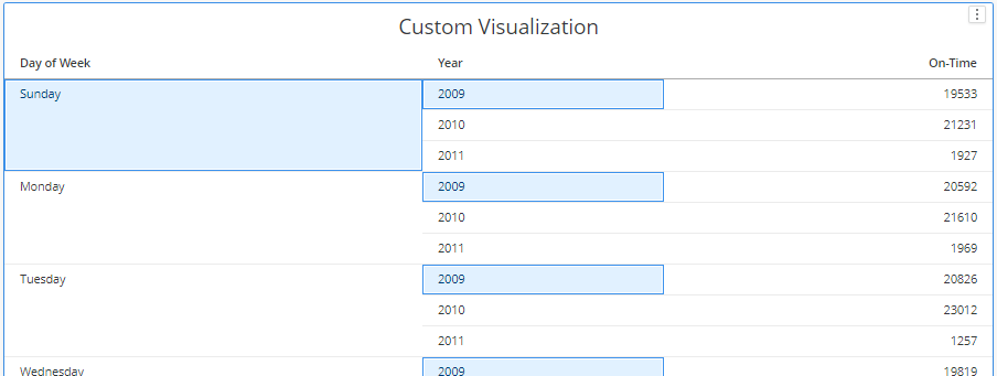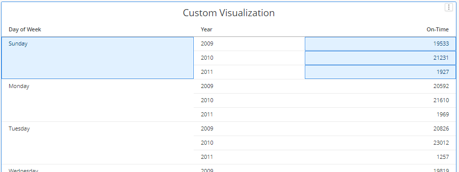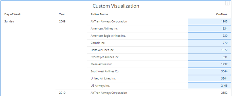For example, if we set the metric parameter to mstrmojo.customviz.PICKED_TYPE.METRIC, and select the data point representing the average delay on Sundays in January of year 2009 in the source visualization, all graphics that contain statistic values of all airlines on Sundays of year 2009 are picked and highlighted in the target visualization. However, the graphic that contains statistic values for Mondays in year 2010 is not picked.