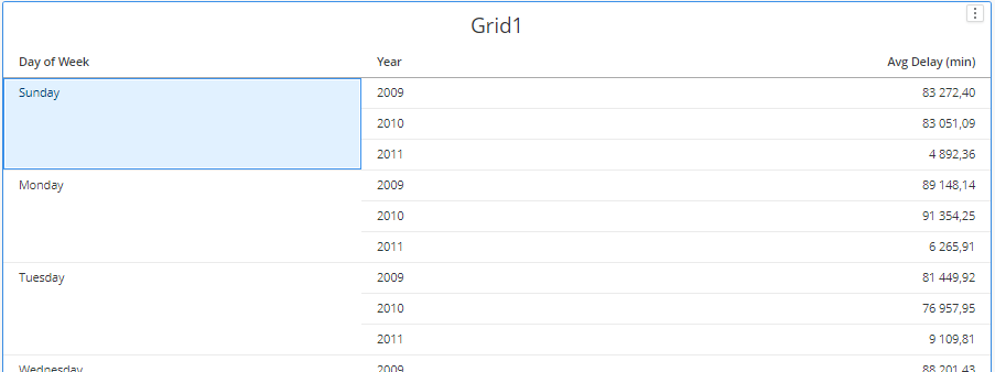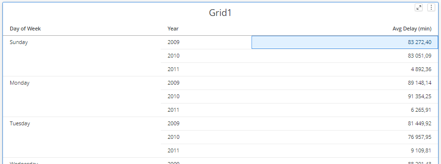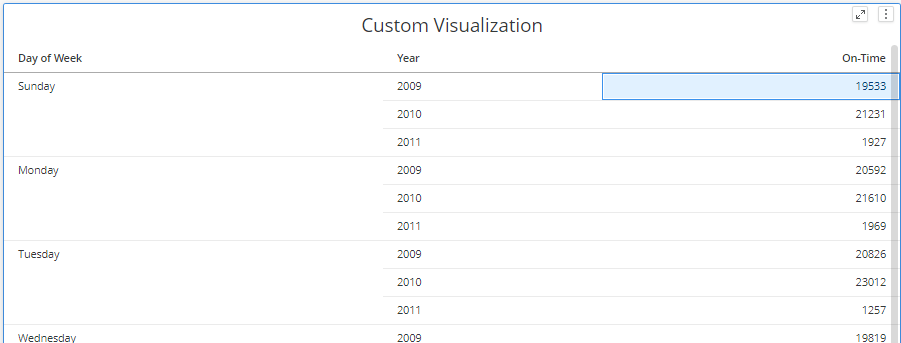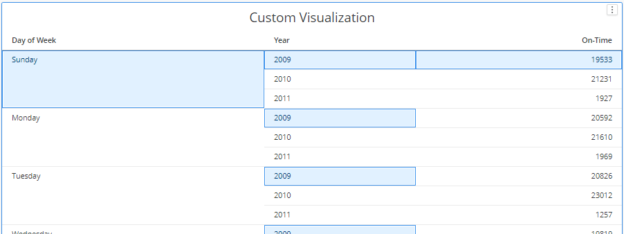 For example, if we select the data point representing the average delay on Sundays in year 2009 in the source visualization, the graphics that represent the header value Sunday and 2009 are picked and highlighted in the target visualization.